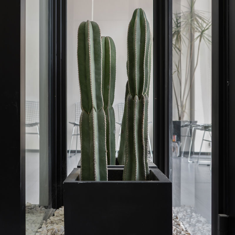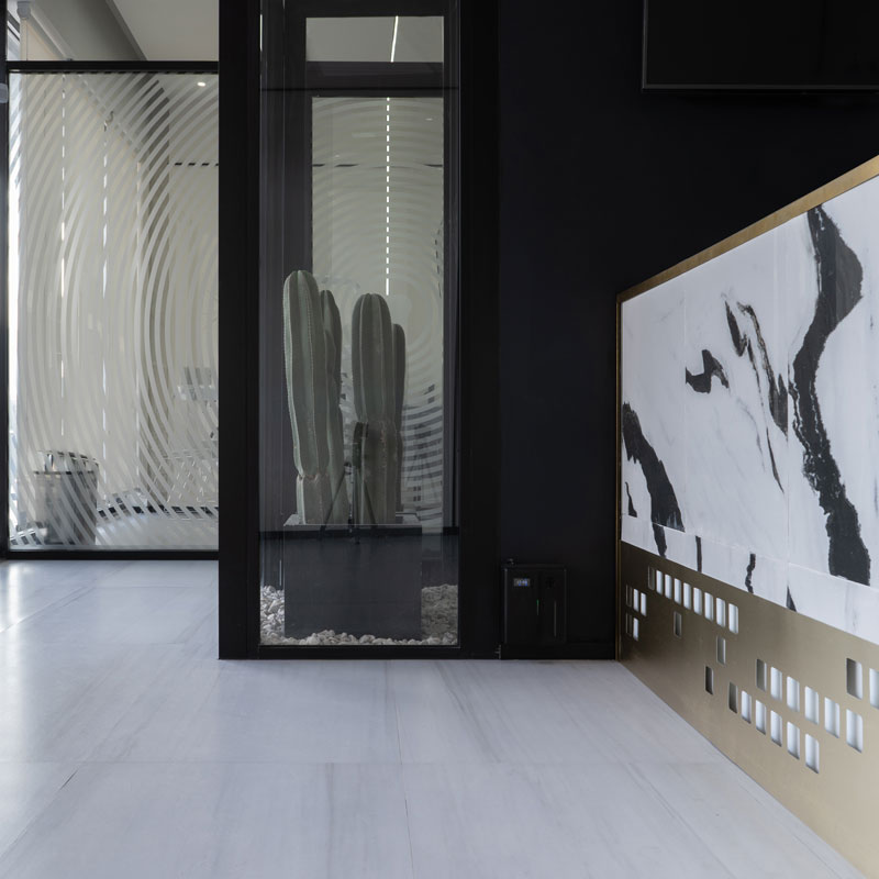 El negro aparece como acento gráfico delgado, elegante, casi tipográfico en marcos y detalles metálicos, luminarias lineales, perfilería y herrajes. No compite, estructura. Marca ritmo.